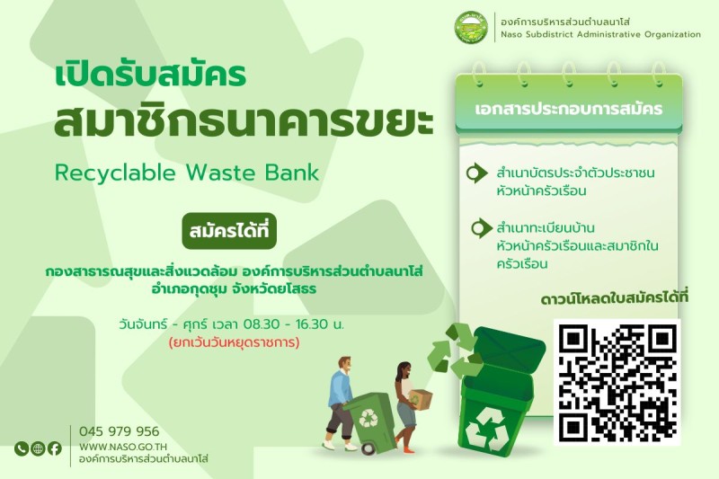 ประชาสัมพันธ์รับสมัครสมาชิกกองทุนธนาคารขยะตำบลนาโส่