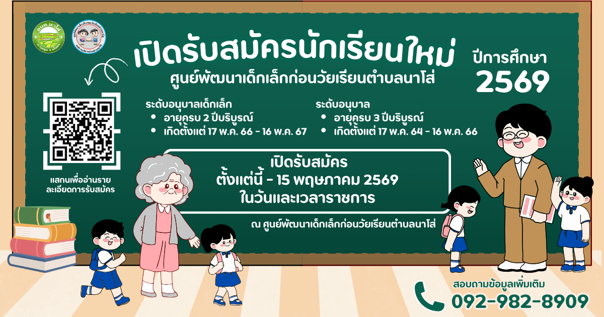 หัวข้อ :: ประชาสัมพันธ์ ประกาศรับสมัครนักเรียนใหม่ ประจำปีการศึกษา 2569 ศูนย์พัฒนาเด็กเล็กก่อนวัยเรียนตำบลนาโส่